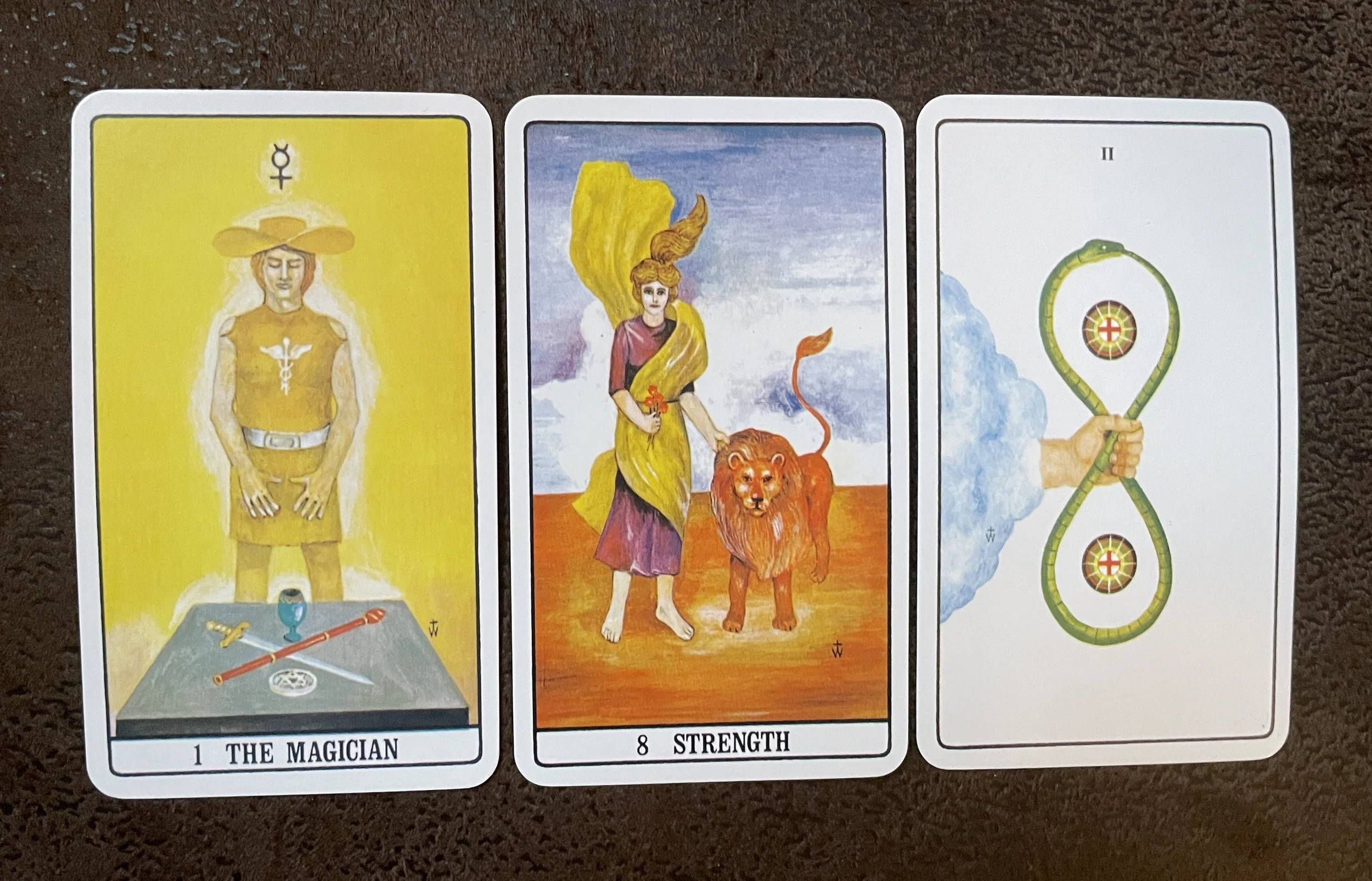 The lemniscate appears on three cards in the RWS deck, the Magician, Strength, and 2 of Pentacles; and this is not accidental. The Magician is card I: the beginning of the Fool's journey, the time of pure potential, the will that sets everything in motion. Strength is card VIII (in the RWS ordering): the card of inner power, of mastering instinct through gentleness rather than force. 2 of Pentacles: represents balance (or lack thereof), adaptability, and managing multiple priorities amidst constant change and effort.