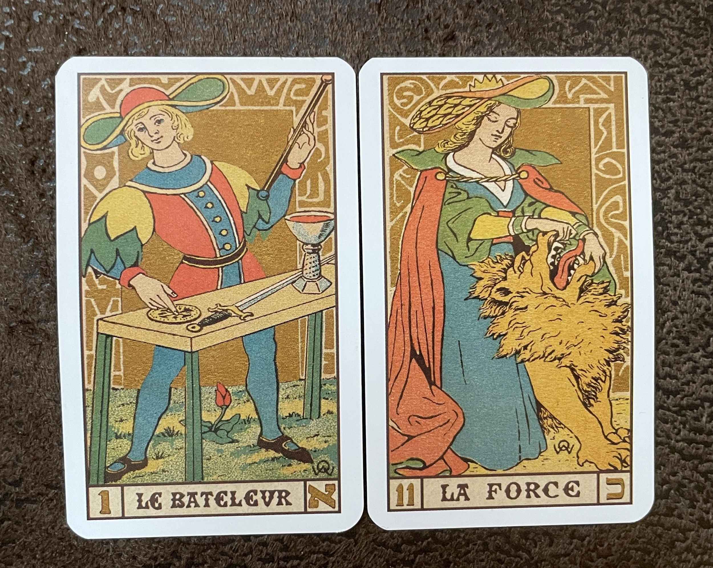The eleventh trump in the Marseille decks is La Force, or Strength. The card depicts a woman opening the lion's jaw. Sometimes, she pries open its jaws; sometimes, she holds the mane.