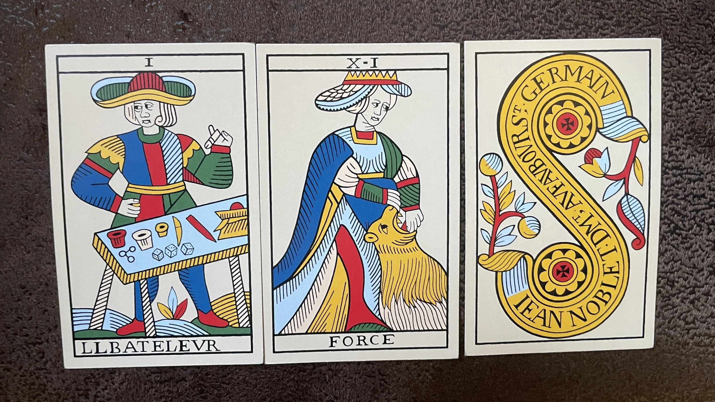 Tarot de Marseille was standardized by the French woodblock printing industry in the 17th century. Its visual traditions come from Italian decks from the 15th century. Here, the first trump card, numbered I, is Le Bateleur, or the Juggler/Conjurer. He is not a magus but a street artist at a table, with cups, coins, a knife, and a ball. He relies on sleight of hand and dexterity.